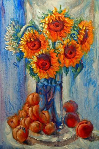 "Sunflowers with apricots and peaches”